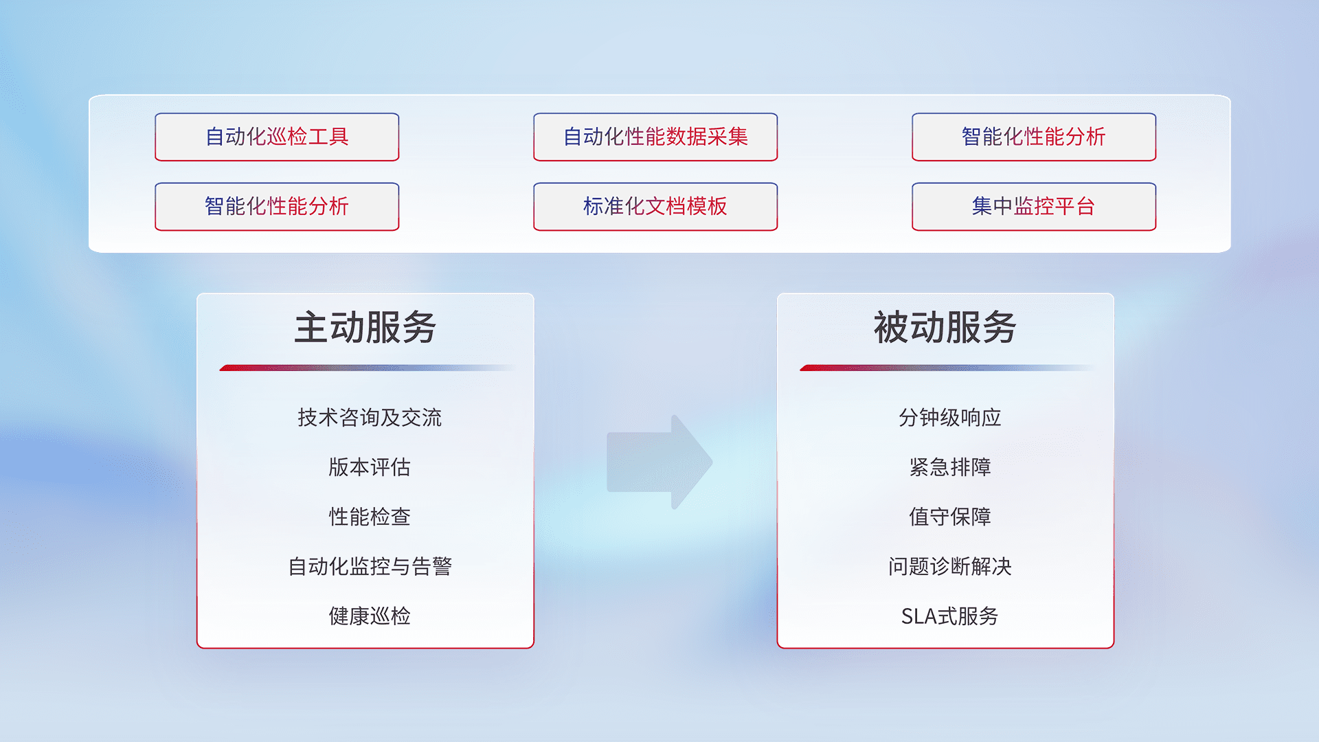 智能化工具和标准化文档,,,,保障服务质量,,提供主动服务(包含技术咨询、、、、版本评估、、、性能检查、、自动化监控与告警、、、、健康巡检)和被动服务包含(分钟级响应、、、、紧急排障、、、值守保障、、问题诊断解决、、SLA服务)。。。。